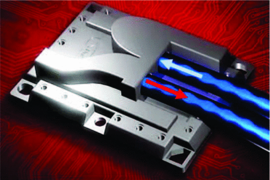 图1.带有入口(蓝色箭头)和出口(红色箭头)水流的直接芯片冷却系统的3D示意图。