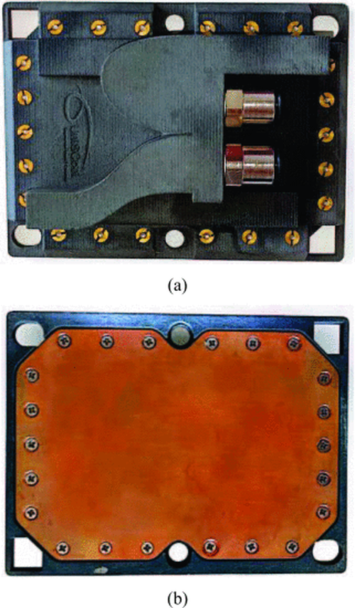 图3.UniSCool设计和制造的直接芯片液体冷却系统的顶视图(a)和底视图(b)的图像。