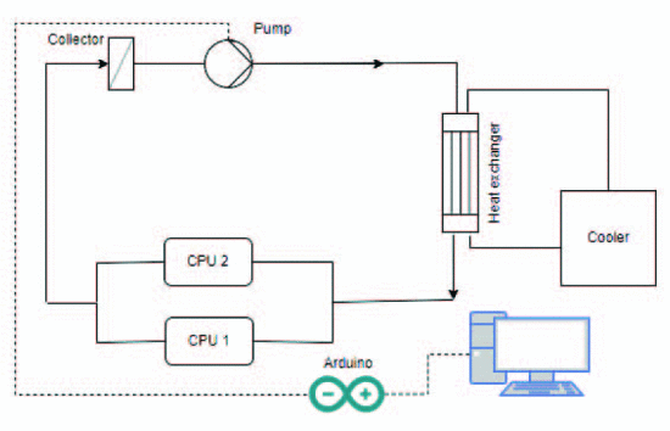 在本研究中,设计了一个液压回路来评估所开发的直接芯片液体冷却技术在真实数据中心条件下的性能(图4)。该回路准确地模拟了运行环境,从而可以全面评估冷却效率以及在实时数据中心运营中实施该技术的实际可行性。设计和制造了一个冷却分配单元(CDU)来封装整个冷却系统,并包含正常回路运行所需的主要元件。这些元件包括一个离心泵,其尺寸可以克服回路的压降并提供足够的流量以将CPU保持在80°C以下;一个液-液(L2L)热交换器,负责在水从入口流向出口时冷却冷板;以及一个集水器,用作气泡提取器。二次水回路在冷却器和L2L热交换器之间循环,以确保入口温度恒定在25°C,从而实现有效的散热。该电路使用Arduino进行操作,它充当数据采集设备并调节泵送功率以维持CPU的更优温度。