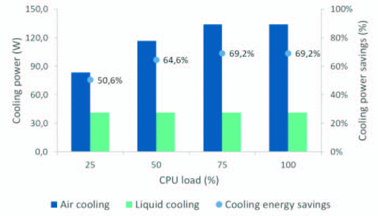该系统经过了可靠性和安全性测试,结果令人满意,并确认所开发的液冷系统可以连续运行长达四天而不会出现问题。此外,与传统的风冷系统相比,液冷系统实现了显著的节能效果。具体而言,根据施加的热负荷,该冷却系统可实现50%至69%的节能效果。在CPU负载最高(75%和100%)时,冷却节能效果最为显著。
