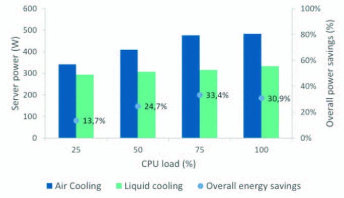 图7.采用空气冷却和直接芯片液体冷却技术的服务器整体功耗,与空气冷却解决方案相比,由于液体冷却而实现了能耗降低。