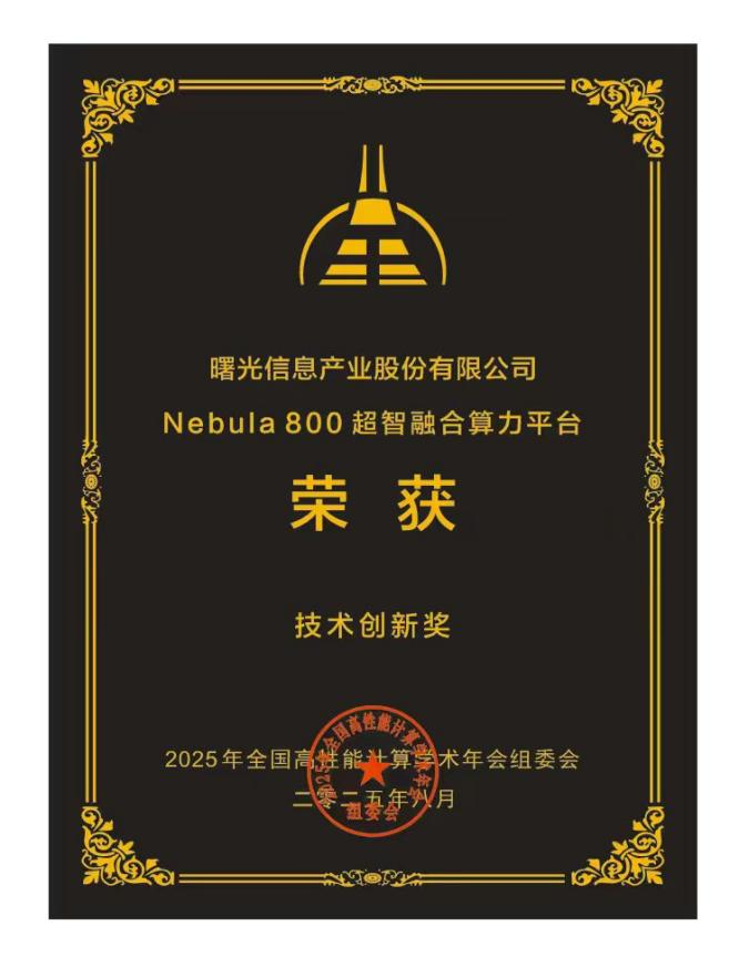 作为首个遵循《超智融合集群能力要求》行业标准研制的高性能计算集群产品,Nebula 800打破了超算、智算的技术边界,实现了二者在算力平台上的深度融合,破解非融合系统计算精度不全、应用普适性差、超算与智算建设“孤岛”、异构资源管理调度困难等问题,为传统超算方法和人工智能新技术在数据、算法、业务层面的深入融合提供了坚实基础,有效支撑材料、生物、气象、工业等行业用户利用高性能计算+AI技术的创新进程。因其突破创新性,Nebula 800荣获2025 CCF全国高性能计算学术大会技术创新奖。