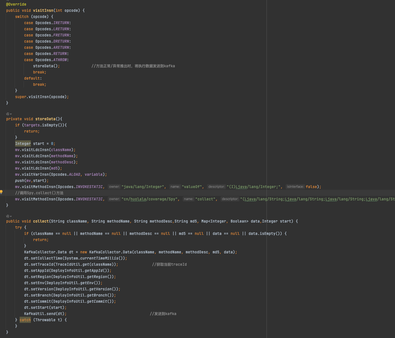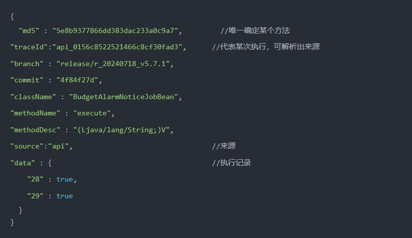 标准化数据契约:我们定义了一套与语言无关的覆盖率数据格式。无论是 Java 还是 PHP 的 Agent,采集到的执行数据都需遵循此规范,包含分支、Commit、TraceID、来源(source)和方法唯一标识(md5)等关键信息。这为后续的统一处理和多维度分析奠定了基础。