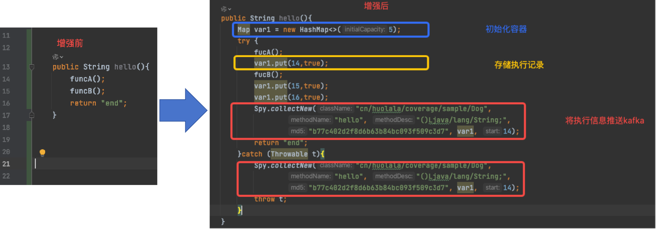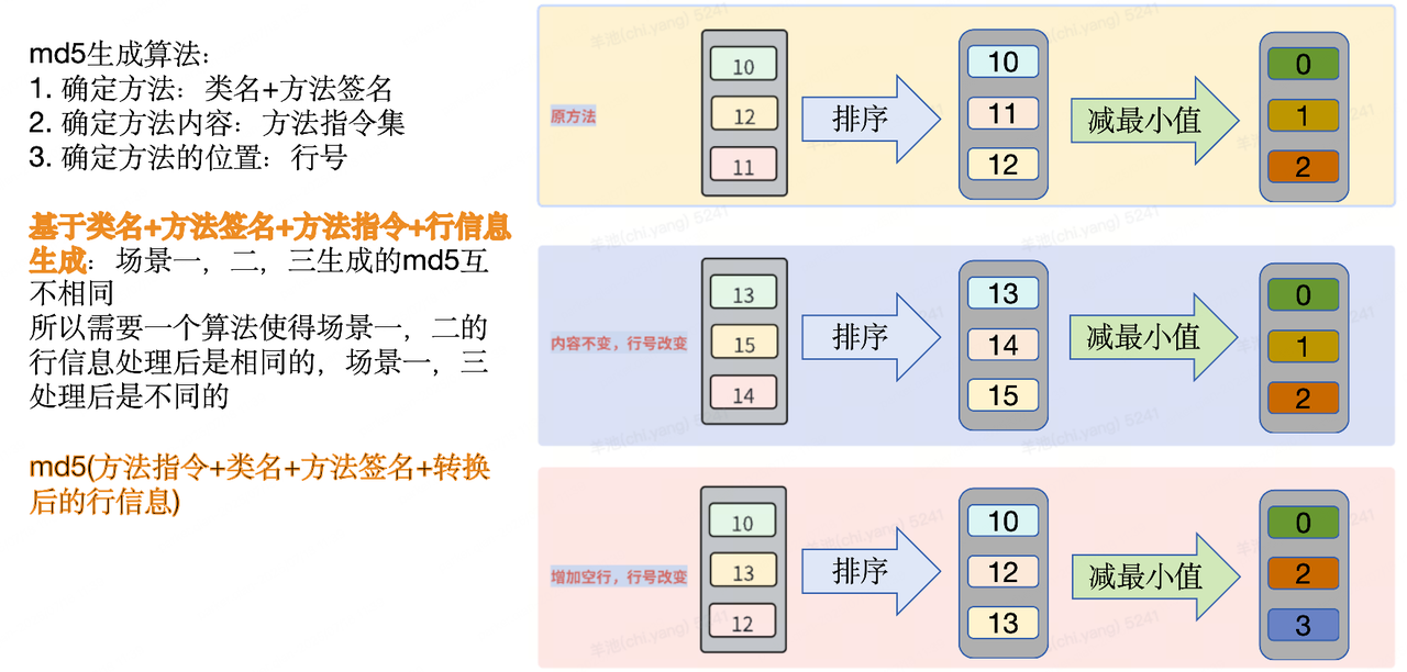方法级精准统计:我们摒弃了过去模糊的类级别统计,将分析核心下沉至方法级别。通过对方法AST(抽象语法树)进行MD5计算,我们为每个方法生成了内容相关的唯一 md5 标识。即使方法名不变,只要代码内容修改,md5 就会改变,确保了统计的精确性。