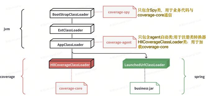 Java Agent 的类隔离创新:为彻底解决 JaCoCo Agent 可能因字节码增强而引发的反射异常和类冲突问题,我们自研了 CoverageClassLoader。它打破了传统的双亲委派模型,将 Agent 的所有依赖(如 Kafka 客户端)都加载到这个独立的类加载器中,形成一个“隔离沙箱”。这确保了 Agent 与业务代码之间绝对的运行时隔离,根除了稳定性隐患。