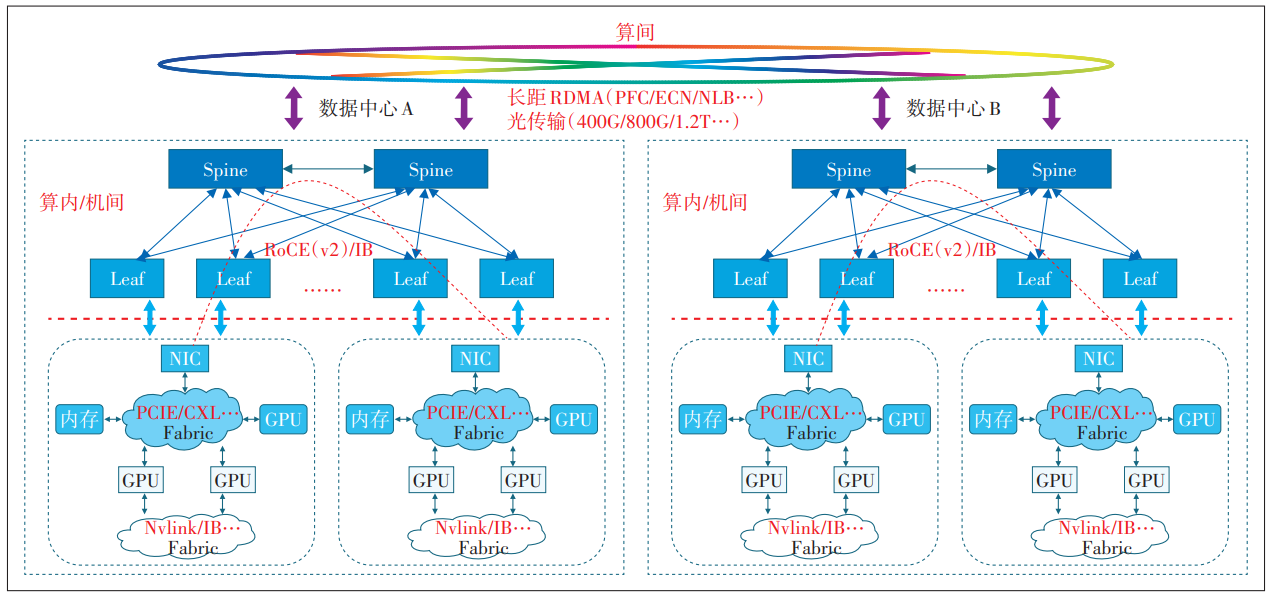 网络不仅能够提供多种灵活的组网架构,还能通过网络协议实现数据的无损传输。此外,网络还配合监控平台和算力管控平台,实现资源的合理分配与优化调度。在跨智算中心的场景中,通过长距RDMA技术和光传输技术,可实现数据的高效、低延迟传输,确保跨中心的数据顺畅流通。智算网络体系是一个集算力、连接、平台应用于一体的综合性体系,旨在满足大模型训练与多样化模型应用的超高算力需求。智算网络体系的架构如图1所示,展示了算力资源、网络连接以及跨中心数据传输的有机整体。