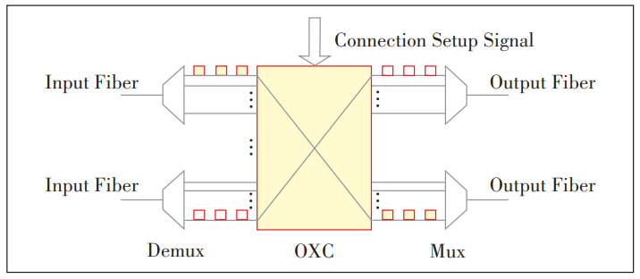 在超大规模的网络中,光电路交换技术也成为当前业界的研究方向。光电路交换技术是在数据中心交换机之间增设光路交换机中间层,以此为数据中心网络创建任意的逻辑拓扑结构(见图3)。汇聚层块通过光纤与光路交换机相连。光路交换机借助2组可在2个维度上旋转的微机电系统镜面,动态地将光纤输入端口映射到输出端口,从而实现任意端口对端口的映射。引入光电路交换的组网架构具备可增量部署的特性,能够按需实现网络逻辑的动态连接,块级流量模式启用动态流量和拓扑工程,实时拓扑和流量工程则实现了网络路径的动态调整。这种引入光路交换机的拓扑方案,其中间转发链路全光透明,具有高带宽、低时延以及低功耗的优势。但是,光路交换机基于线路交换,不具备以太网的灵活交换的寻址能力,因此对控制层面的调度机制要求较高,高度依赖控制器来实现IP和光的协同,适用于智算网络集合通信和模型训练较为固定的场景。