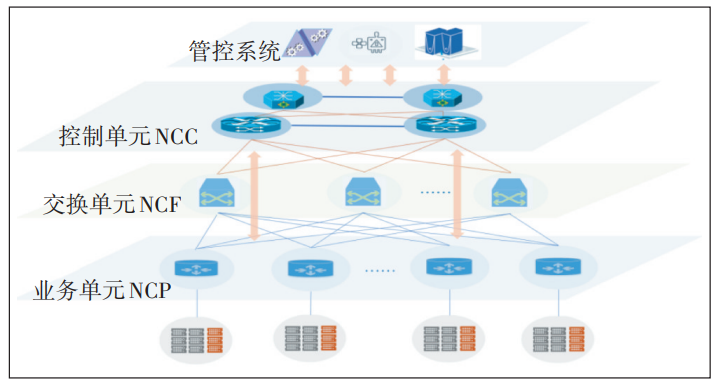 分布式解耦技术将传统的集中式物理机框设备解耦为分布式盒式设备,易扩展且有效提升网络规模,可满足大规模承载的需求;采用信元负载均衡机制,避免网络拥塞,提高AI智算效率。基于分布式解耦技术进行了分布式解耦的网络能力增强试验,方案中包含控制单元、交换单元、业务单元和管控系统(见图6)。控制单元作为核心,控制网络指令下发和网络组建等关键行为,对整个网络进行控制;交换单元作为Fabric节点,承担数据报文的交换工作,与业务单元全互联;业务单元负责接收和发送以太网数据报文;管控系统负责自动化配置、端网拓扑可视化和全栈数据采集分析。控制单元通过远程控制协议打通管理层、协议栈和转发面,采用新的仲裁机制来确保集群稳定性。