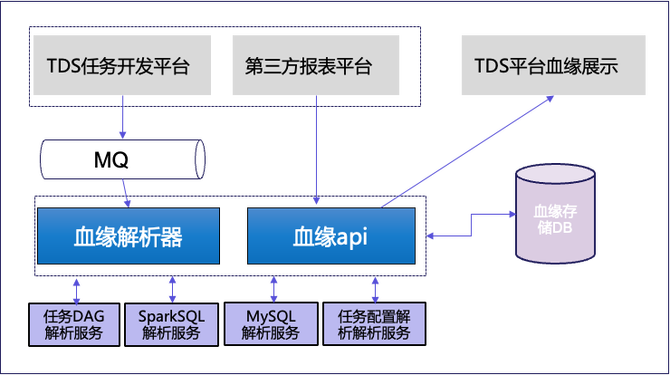 上图展示了TDS血缘治理系统的整体架构,涵盖从信息采集、解析、存储到对外展示的全流程。