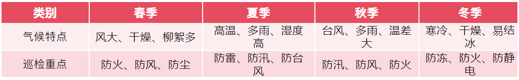 巡检中,春季要加强对空调、新风过滤网的检查,严防堵塞引发的效率下降;夏季要加强对制冷系统、水循环管路及湿度监控的巡检频次,严防过热宕机与凝露;秋季要加强对园区排水系统等巡检;冬季则重点关注户外管道防冻、静电预防及加热装置运行状态。
