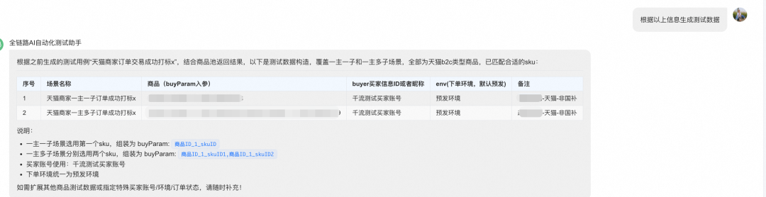 根据测试用例及关键信息由AI自动匹配高质量测试商品、买家、卖家、门店等数据。
