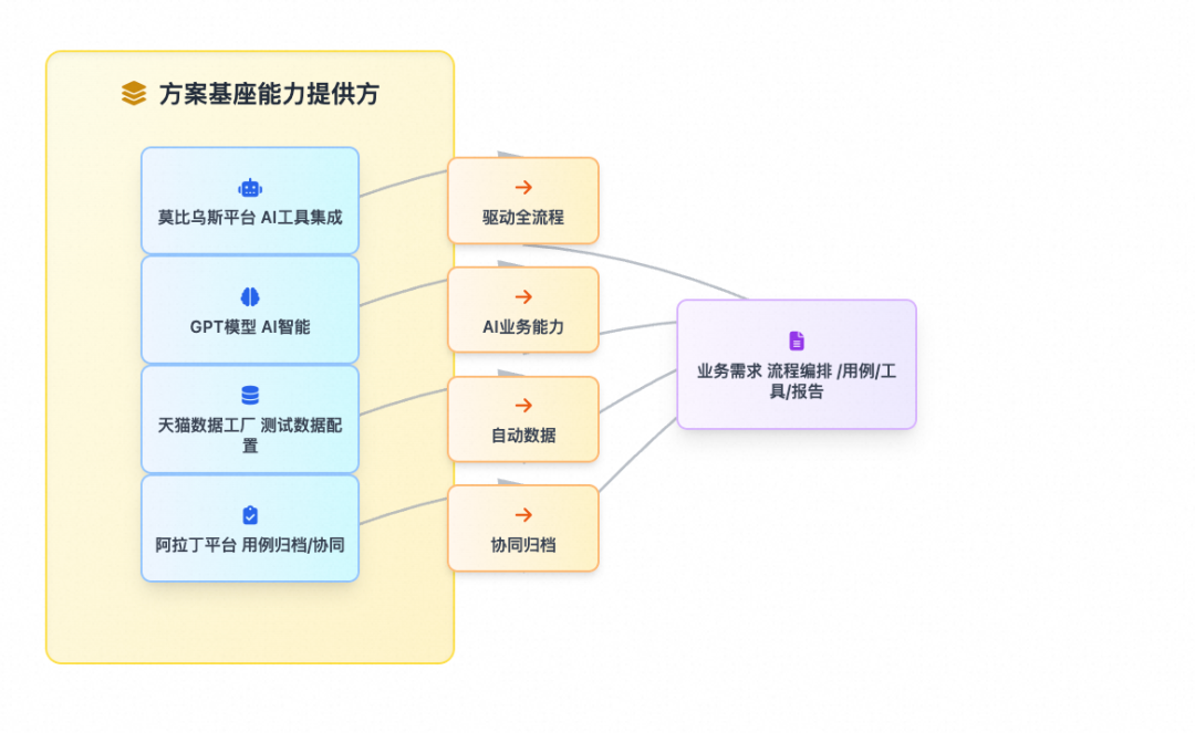 AI结合数据工厂和工具编排,自动感知业务变更,快速调整测试范围与策略,知识资产不断沉淀。