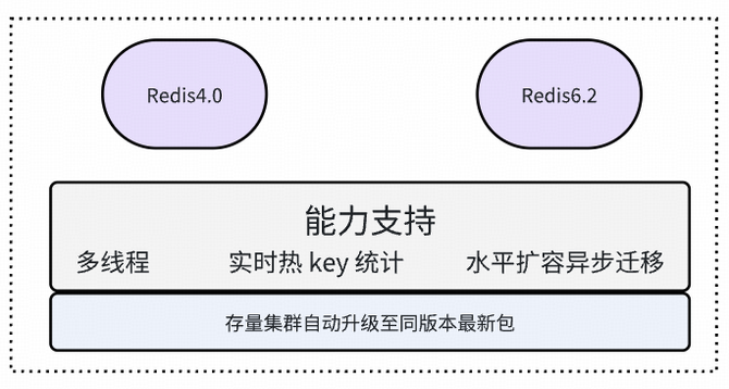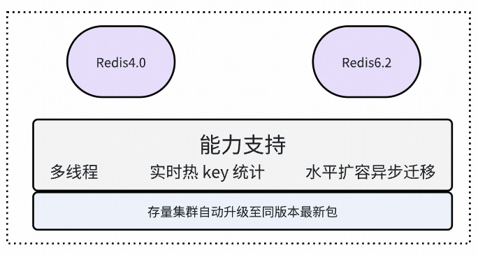 不管是 Redis4.0 还是 Redis6.2 版本,均支持了多线程特性、实时热 key 统计能力、水平扩容异步迁移 slot 能力,存量集群随着日常资源均衡迁移调度,集群节点版本会自动升级到同版本的最新安装包。