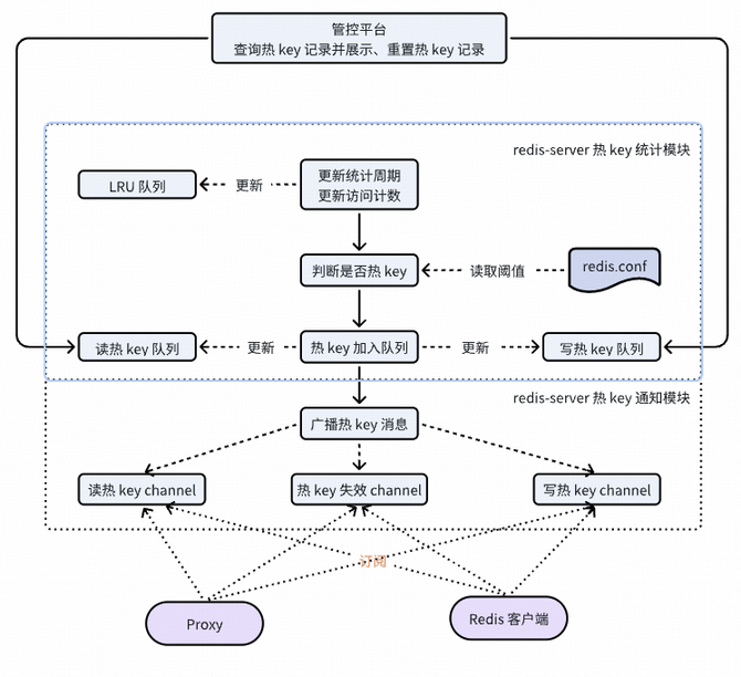 自建 Redis4.0 和 Redis6.2 版本均支持 Redis 服务端实时热 key 统计能力,管控台白屏化展示,方便快速排查热 key 导致的集群性能问题。方案详细可阅读《基于Redis内核的热key统计实现方案》