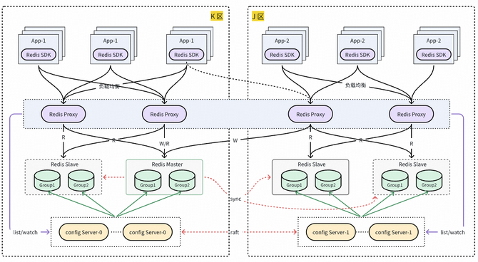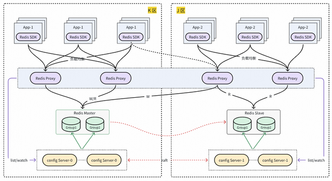 自建 Redis 同城双活采用中心写就近读的方案实现,可以降低业务多区部署时访问 Redis RT。