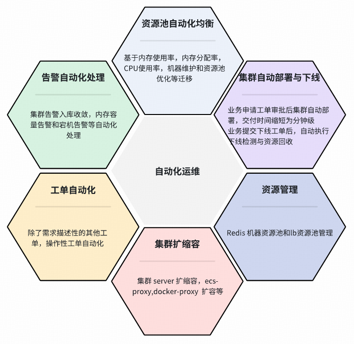 自建 Redis 系统还包含一个功能完善的自动化运维平台,一直以来,自建Redis一直在完善系统自动化运维能力,通过丰富的自动化运维能力,实现集群全生命周期自动化管理,资源管理与智能调度,故障自动恢复等,提高资源利用率、降低成本,提高运维效率。