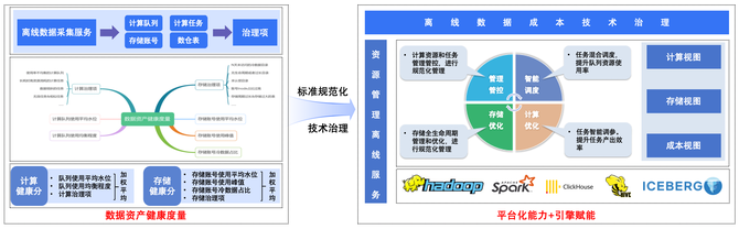 一方面,我们针对各个业务的计算队列和计算任务的管理,通过平台能力实现了从计算资源的注册接入,到计算队列和任务数据的采集,再到离线数据分析和挖掘,最终形成如使用率不均衡的计算队列、长耗时高资源消耗的计算任务、数据倾斜的任务、无效任务以及相似任务等多个计算治理项,并基于统一规范的健康分机制来对业务计算资产进行度量,指导业务对计算进行治理。