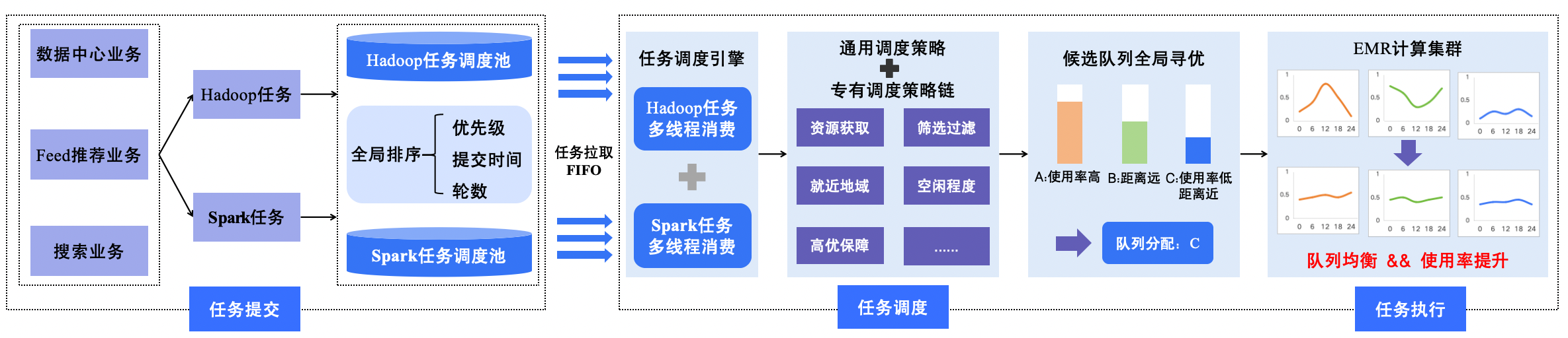 为解决上述问题,我们建设Hadoop和Spark混合调度机制。针对公司不同业务来源的任务,基于Hadoop调度引擎以及Spark调度引擎完成各自任务的智能化调度,并通过调度策略链在多个候选队列中选择最优队列,最终实现任务提交到EMR计算集群上进行执行。具体流程如下: