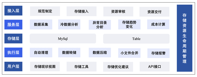 接入层:通过建立规范的存储资源管理机制,比如存储的接入和申请规范、目录的创建规范、使用规范、利用率考核规范(Quota回收规范)以及冷数据的处理规范等通用化的规范,进而来完成用户从存储资源的接入-申请(扩容)、审核、交付、资源的例行审计的整体流程。