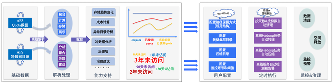 在AFS存储资源的生命周期管理过程中,我们主要基于服务层和执行层为用户提供一套基础的存储AFS账号数据基础治理能力。通过离线解析Quota数据和冷数据目录相关的基础数据,完成对其计算、分析、聚合等处理,实现存储趋势变化、成本计算、异常目录分析、冷数据分析、数据治理项和治理建议等多方面能力支持。之后,用户便可结合存储数据全景视图分析和相关建议,进行存储路径配置、转储集群目录配置、压缩目录配置以及监控账号配置等多维度配置。基于用户的配置,通过后台离线服务定时执行,完成对用户存储的数据清理、空间释放和监控预警,保障各个业务存储账号的合理使用以及治理优化。