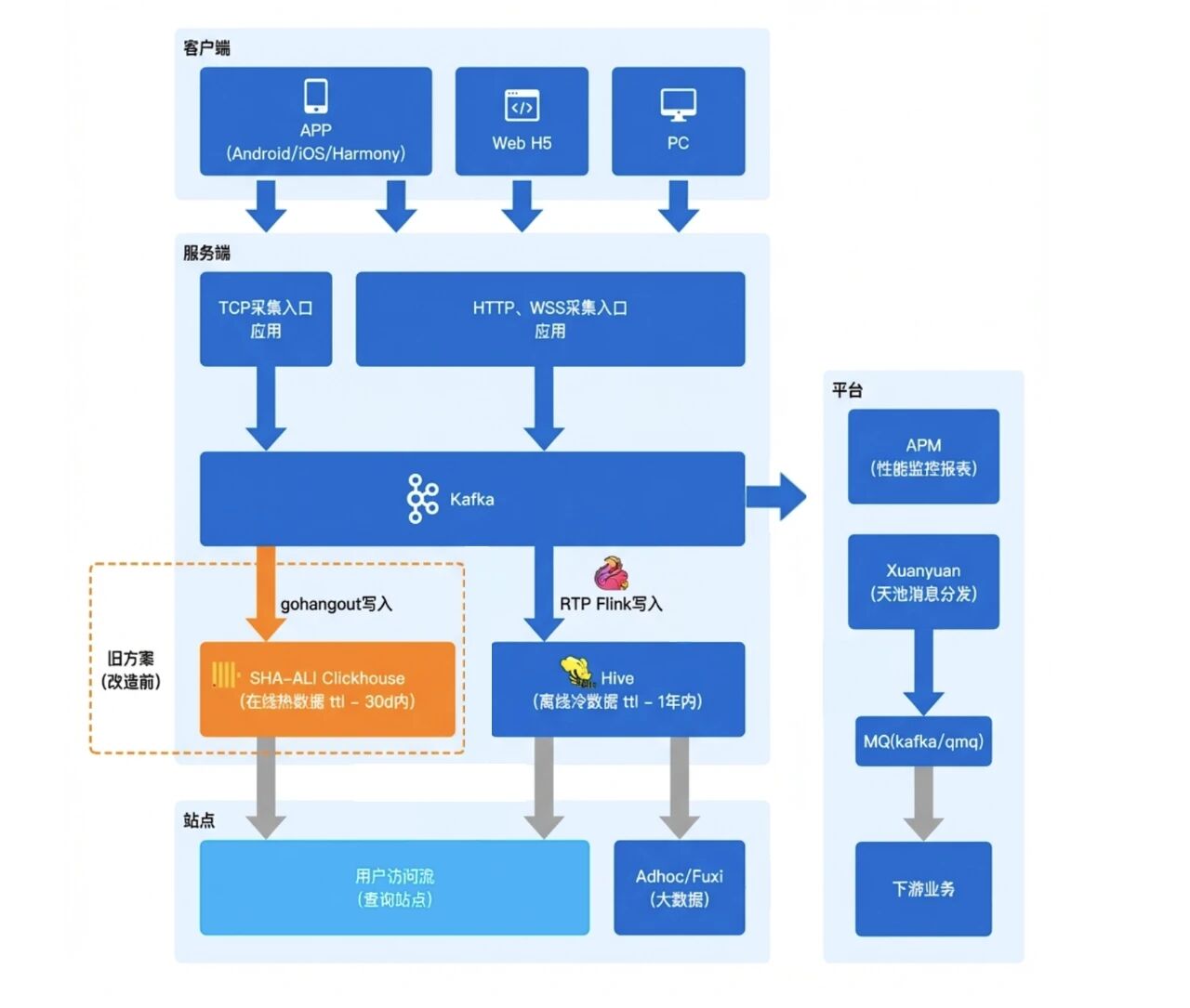 此外,右侧还有多个业务平台基于这些数据进行消费和处理。