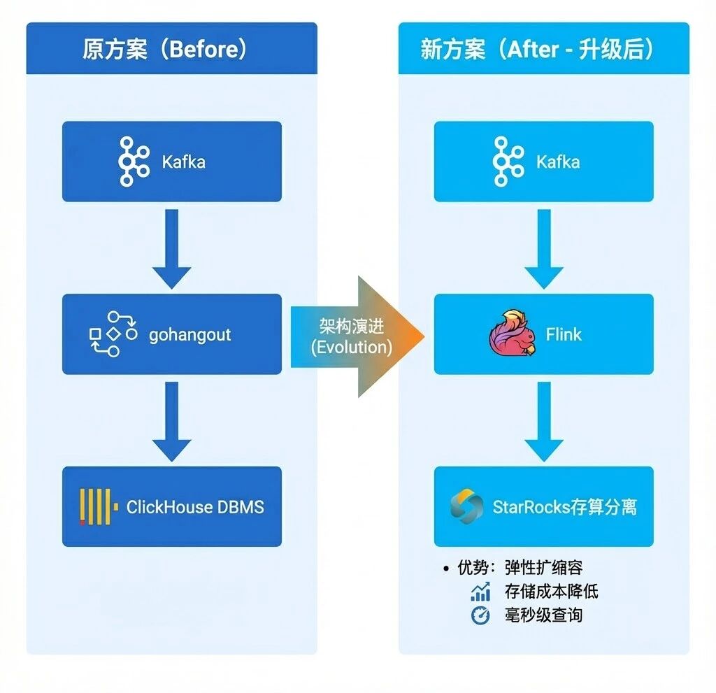 本次改造的重点在于上图中红色框标注部分——即gohangout + ClickHouse,最终将其替换为Flink + StarRocks。