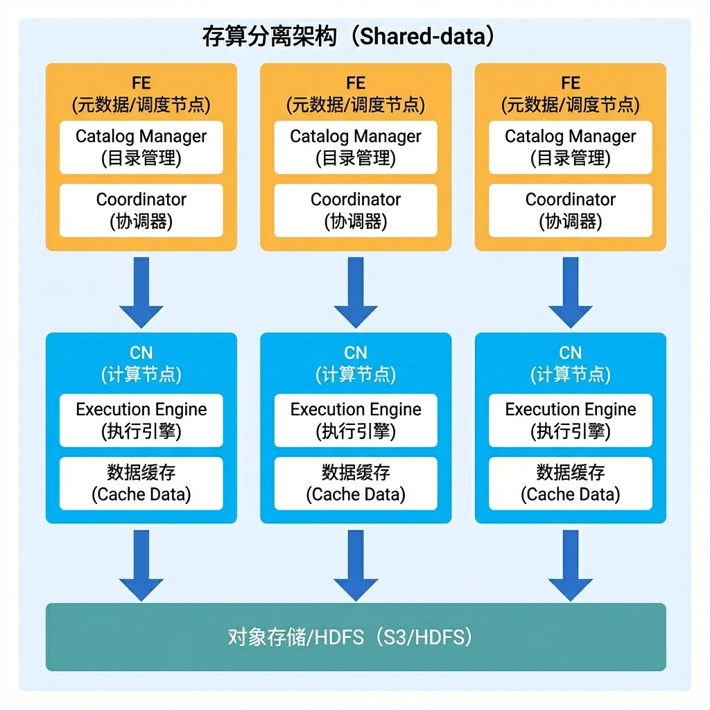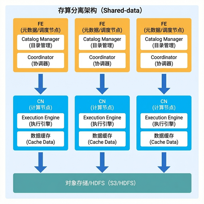 因此,StarRocks 进一步演进为存算分离架构:计算节点无状态化,仅保留计算引擎,能够根据业务需求灵活调度;存储则托管于远端对象存储(OSS/S3),实现计算与存储的彻底解耦,另外为了保证查询速度,计算节点可以打开 DataCache。该架构既提升了资源利用率,避免资源浪费,又显著降低了存储成本,同时也保证了查询速度。例如,相比存算一体架构下的三副本冗余,存算分离模式仅需一份本地副本即可保障可靠性。