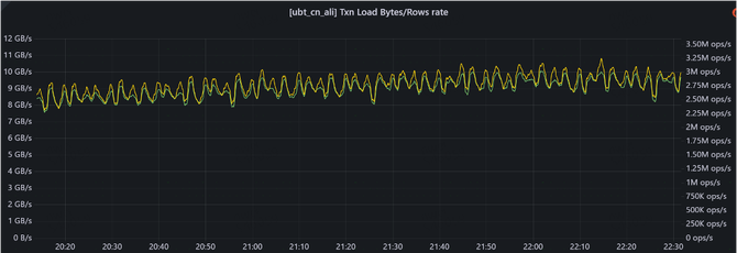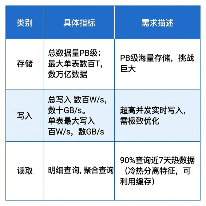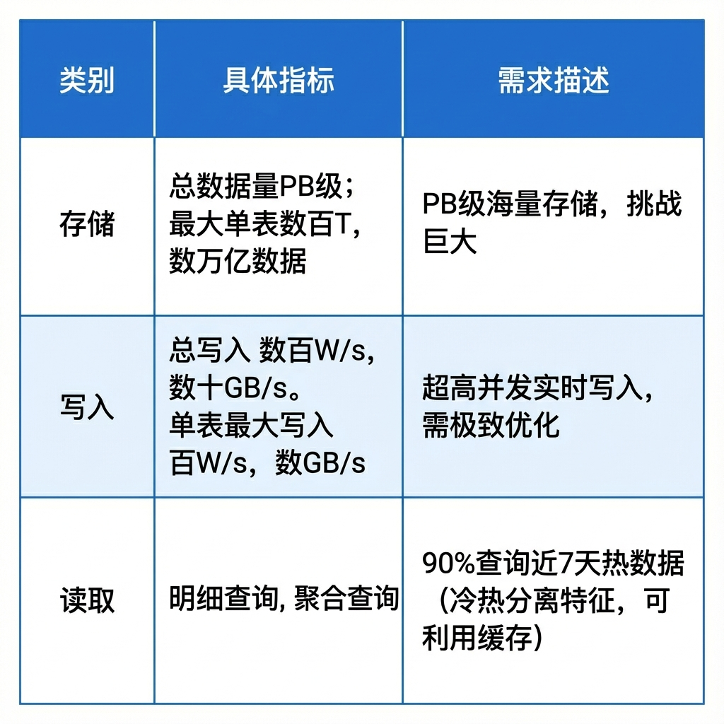 UBT 系统总数据量约为 PB级,其中最大的单表规模达到百TB,包含数万亿行数据。写入压力巨大:整体写入速率约为每秒数百万行/数十GB,其中单表最大写入量达到每秒百万行/数GB。