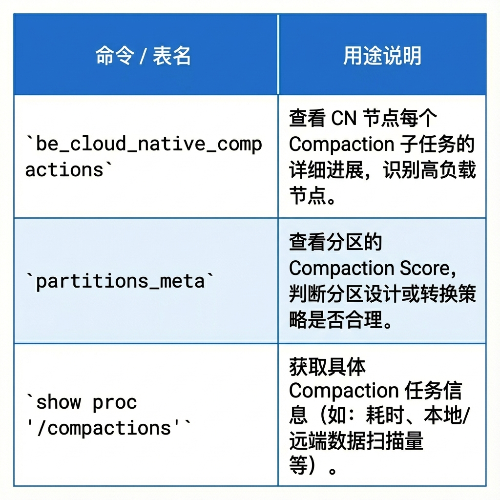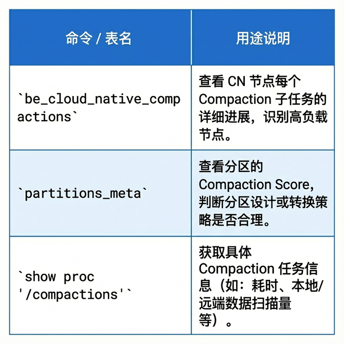 此外,利用 show proc compactions 命令,可以获取具体的 Compaction 任务信息,包括任务的开始与结束时间、总执行时长,以及本地与远端数据的扫描量。例如,当远端数据的扫描量偏高时,往往提示需要检查 DataCache 的配置是否过小,从而为性能优化提供参考。