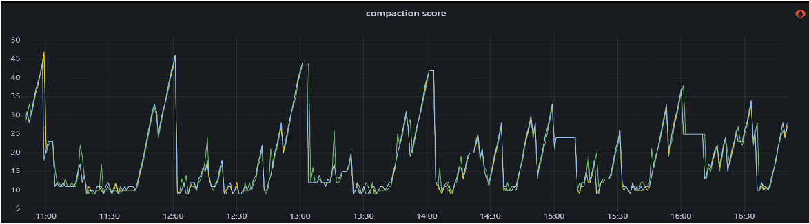 最后,团队将相关监控指标接入 Grafana,并通过 SQL 图表进行可视化展示。一般而言,当 Compaction Score 维持在 100 以下时,系统处于较为理想的状态。