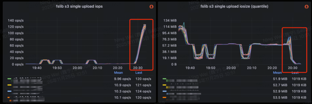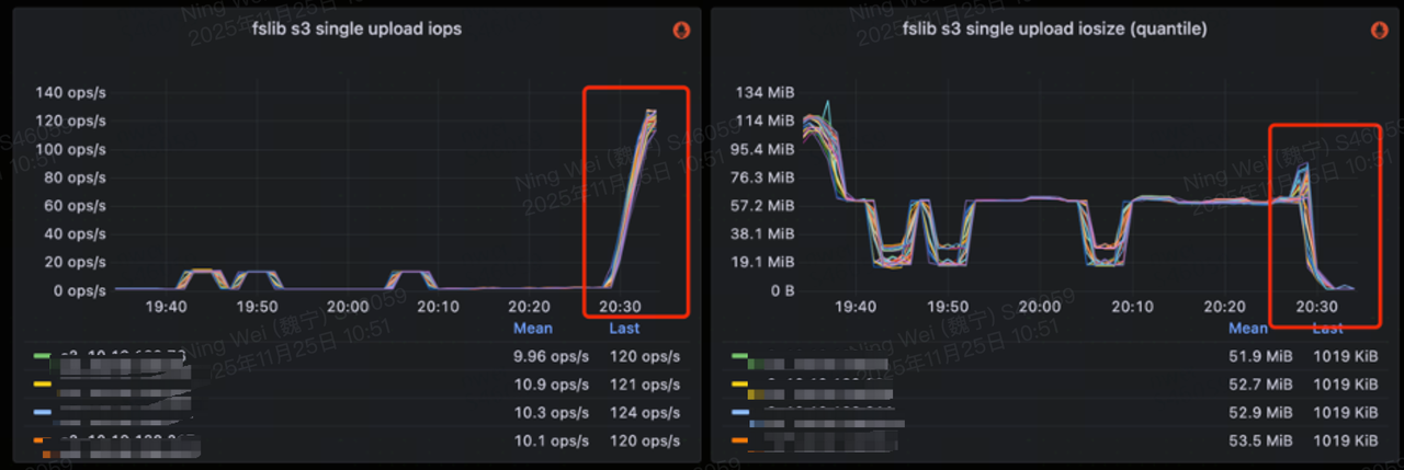 在写入吞吐上,传统模式以高频的小批次写入为主,吞吐有限;而 MergeCommit 通过聚合形成大批次写入,大幅提升了整体吞吐能力。实际对比显示,在关闭 MergeCommit 的情况下,StarRocks 的 IOPS 通常在 140 左右;而开启 MergeCommit 后,合并了大量写入,IOPS 可降低到 10以下。实现近 10 倍提升,写入的 I/O Size 也提升约 10 倍。