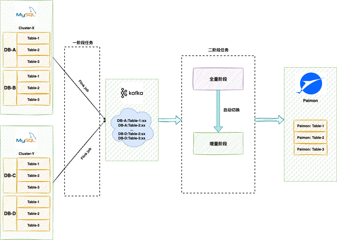 第一阶段(source 任务):由平台统一管理的共享 Flink 作业。该任务负责从指定 MySQL 实例读取 binlog,并将增量数据分发至 Kafka。此任务对普通用户透明且不可操作,确保了对核心 DB 资源的合规、高效复用。