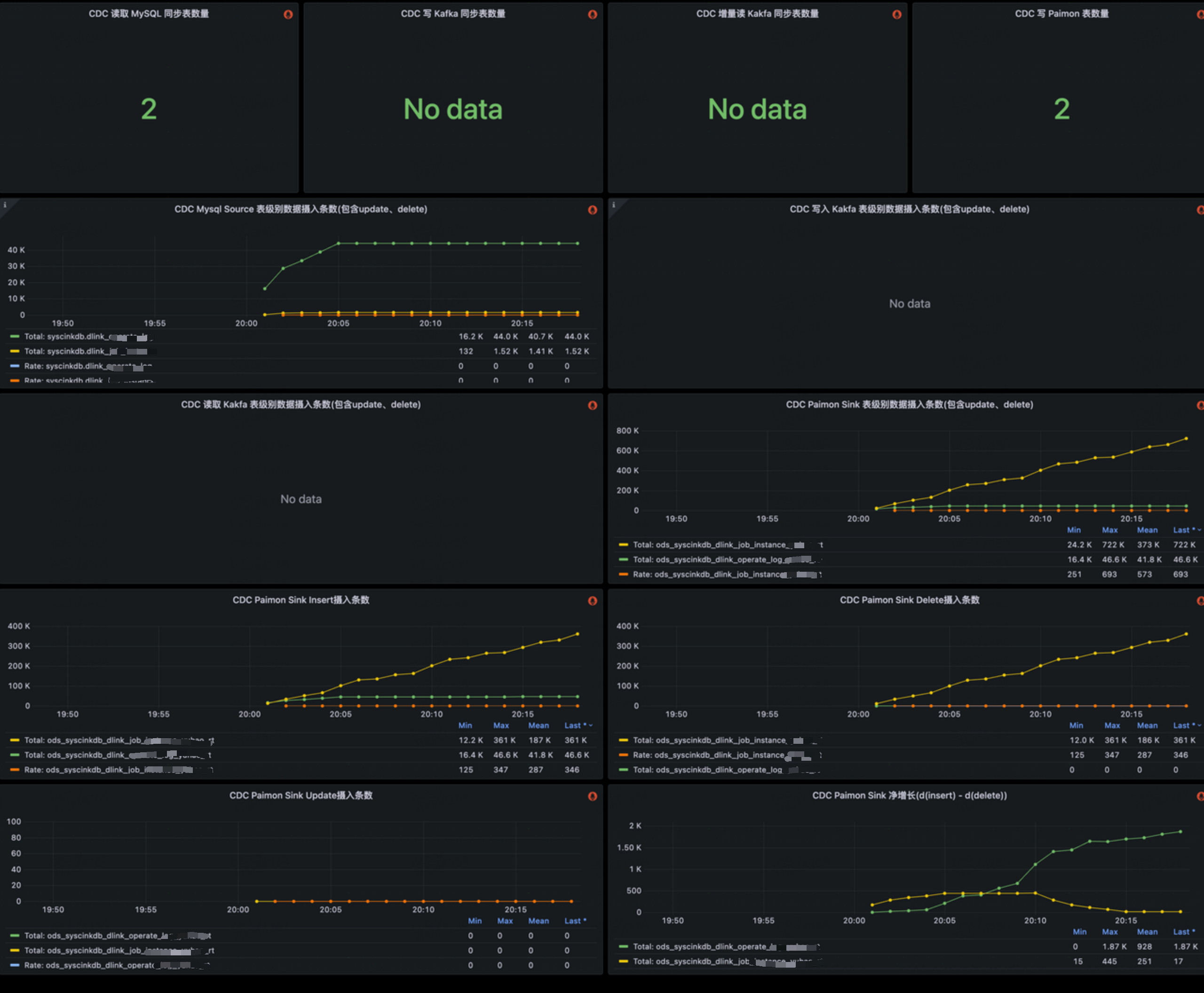 我们建立了覆盖全链路的表级别监控体系。通过内置的批流切换事件通知, 如图 8 所示,用户可以清晰地了解作业当前状态(全量/增量/回补)。从 MySQL 到 Kafka,再到 Paimon,数据流在各环节的出入口均增加了表级别的指标埋点,用户可基于这些指标配置数据断流、延迟等告警,实现了精细化的可观测性(图 9-图 10)。