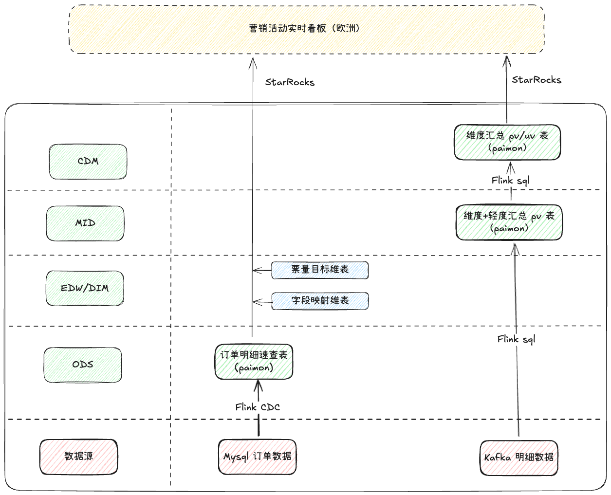 解决方案:解决上述问题的关键就是提升整体业绩流程的更新频率,通过更新加速,实现所有海外业务所在时区可以及时、准确看到业绩统计数据。最终海外业务采用了近实时湖仓的链路,其整体的链路如下所示: