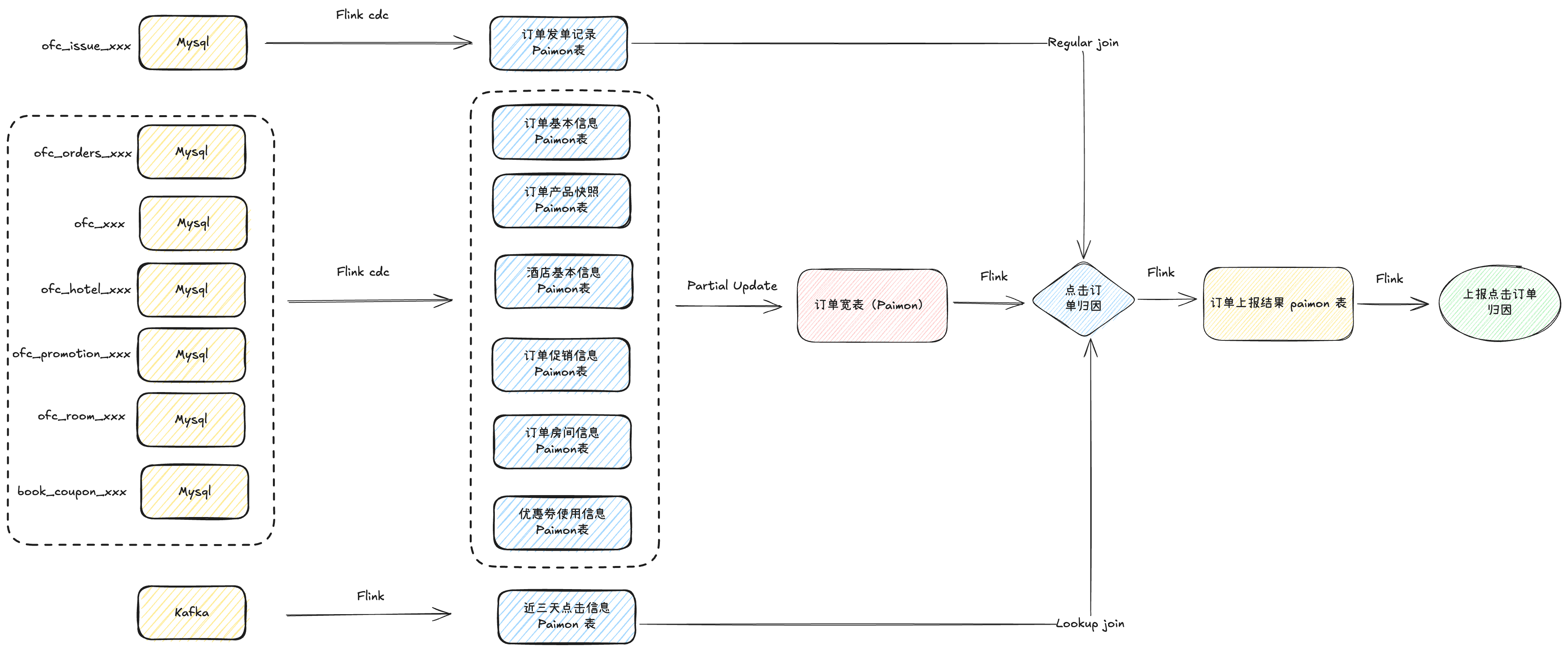 在广告投放场景方面,涉及广告的曝光、点击与下单行为的准实时上报。下单行为需与用户近 3 日内的点击日志进行归因匹配,只有在下单前 3 日内存在有效点击行为的订单,方会上报给广告主。该订单上报流程对响应速度有一定要求,业务方希望实现从触发到上报端到端的分钟级时效。