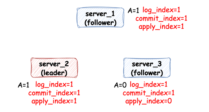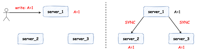 有以下 3 个服务构成的分布式集群,并在 server_1 中发生写请求变更 A = 1,“正常情况下” server_1 将 A 值同步给 server_2 和 server_3,保证集群的数据一致性: