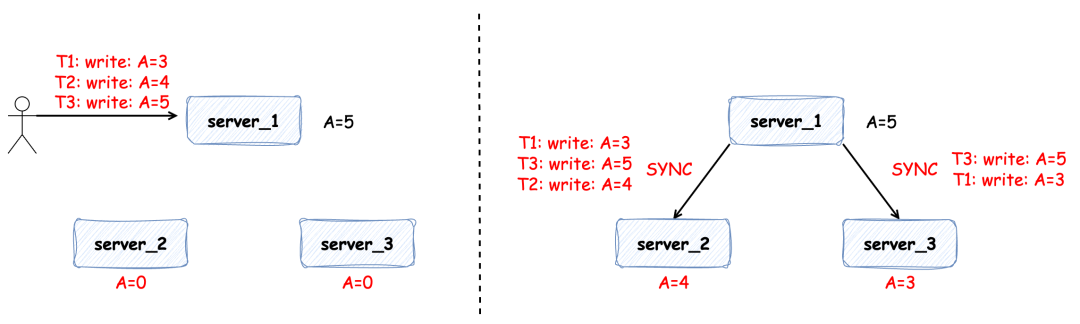 同样地情况,如果在 server_1 上发生三次写操作,在数据同步的过程中因为网络延时或网络丢包也可能会导致数据的不一致: