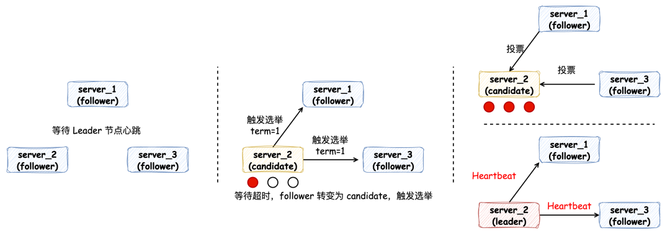 在遵循 Raft 算法的集群中,节点会有 3 种不同的角色。当集群在初始化时,每个节点的角色都是 Follower 跟随者,它们会等待来自 Leader 节点的心跳。因为此时并没有 Leader 节点,所以会等待心跳超时。等待超时的 Follower 节点会将角色转变为 Candidate 候选者,触发一次选举,触发选举时会标记 Term 任期变量,并将自己的一票投给自己,通知其他 Follower 节点发起投票。经过投票后,收到超过半数节点票数的 Candidate 节点会成为 Leader 领导者节点,其他节点为 Follower 跟随者节点,Leader 节点会不断地发送心跳给 Follower 节点来维持领导地位: