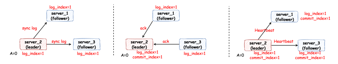 随后,Leader 节点会更新最新同步日志的索引 commit_index 为 1,并通过心跳下发给各个 Follower 节点: