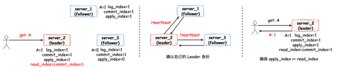 举个简单的例子,假如选举过期时间是 10s,时钟漂移为 1.1,那么租约过期时间为:lease_end = current_time() + 10s / 1.1 ≈ current_time() + 9s,如果在处理读请求时,在租约时间内,则无需发送 Heartbeat 来明确 Leader 身份,直接等待 apply_index >= commit_index 后返回请求结果。