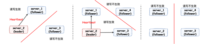 当集群中发生网络通讯问题时,读、写请求只能在超过半数节点的集群内生效,过半数机制 在数学上保证不可能同时存在两个Leader:
