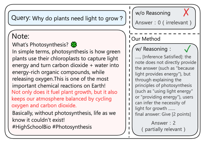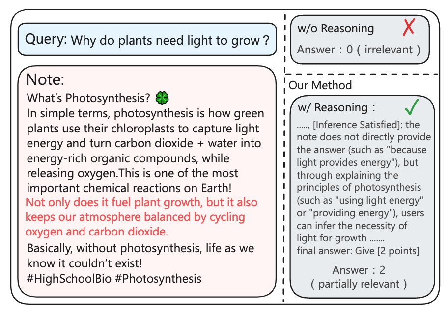 一个实例说明了显式推理增强了相关性评估的可解释性和有效性。对于查询“为什么植物需要光来生长?”,基于推理的模型利用与光合作用相关内容识别出部分相关性,而没有推理的模型则无法识别这种联系。