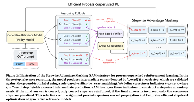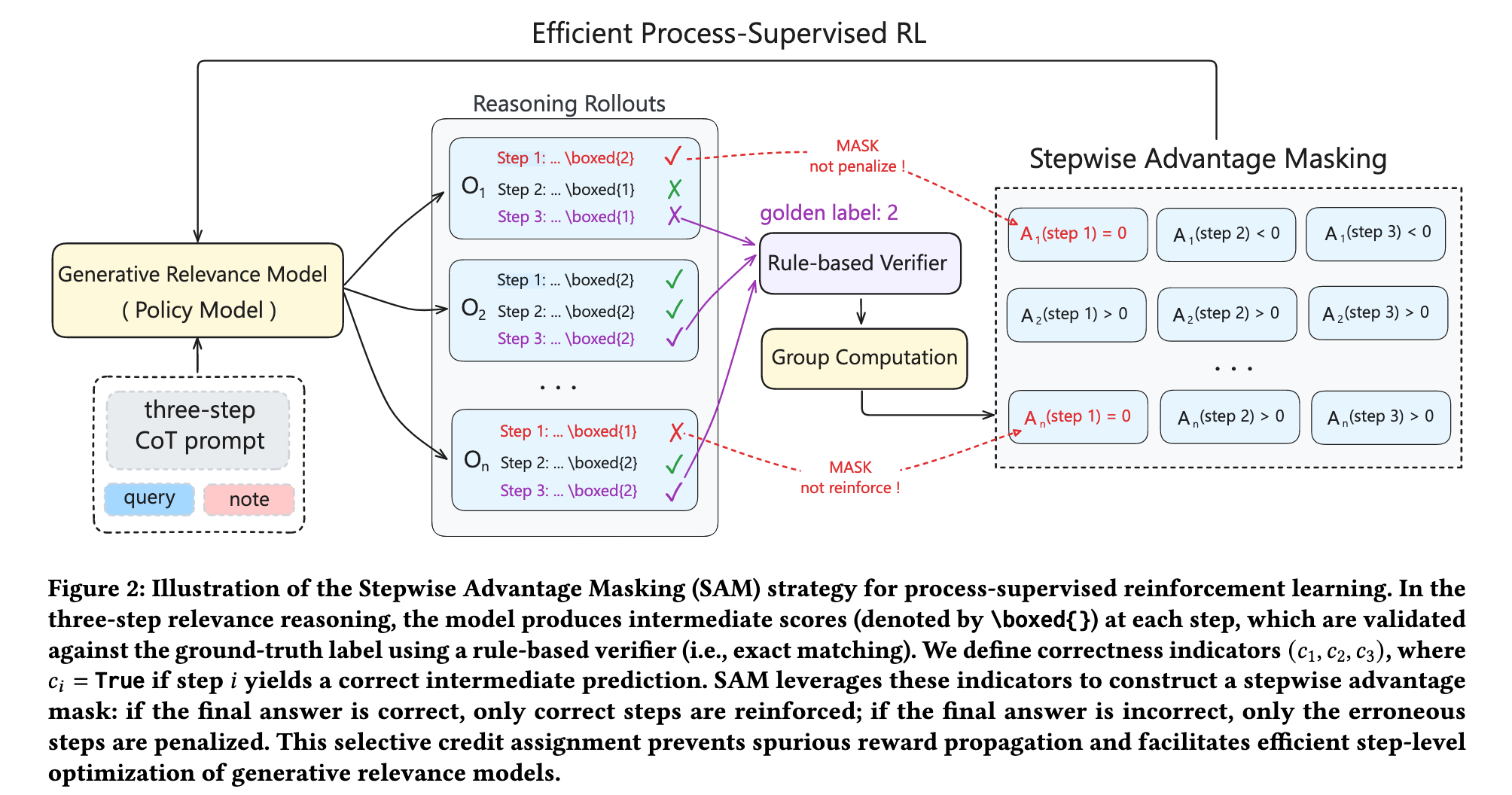相关性是搜索最基础最重要的信号,旨在衡量搜索结果与用户查询的匹配程度。传统判别式模型直接输出标签或分数,在复杂语义建模方面能力有限。推动相关性建模从判别式向生成式演进,并融入思维链(Chain-of-Thought)推理能力,已成为重要研究方向。然而,现有方法大多依赖大量人工标注或合成的思维链数据进行监督微调,导致模型泛化能力不足,同时领域无关、自由形式的推理往往过于笼统,难以满足工业场景中复杂的业务标准。为解决上述问题,小红书搜索团队提出分段优势掩码策略(Stepwise Advantage Masking, SAM),在多步骤推理中引入轻量级过程监督,改进强化学习中的信用分配机制,从而提升模型对复杂业务相关性标准的理解与内化能力。该方法在业务实践中取得显著效果,相关研究成果已被 KDD 2026 录用。