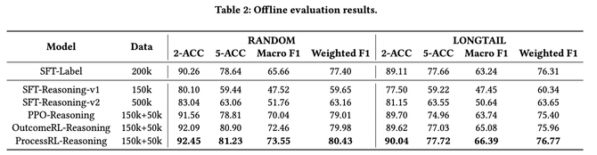 SFT-Label(标签监督模型)使用20万条纯标签数据训练,在RANDOM数据集上的2-ACC/5-ACC达90.26/78.64,在LONGTAIL数据集上达89.11/77.66,确立强基准性能。