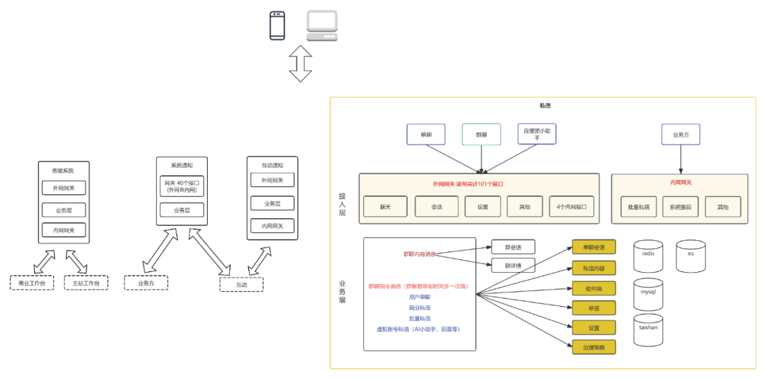 按业务全域现状,在服务端角度分成客服系统、系统通知、互动通知和私信4个业务线,每个业务线内按现状标识了服务分层。私信内分为用户单聊、bToC的批量私信、群聊和应援团小助手四类,这四类细分私信没有技术解耦,单聊和批量私信比较接近系统天花板。