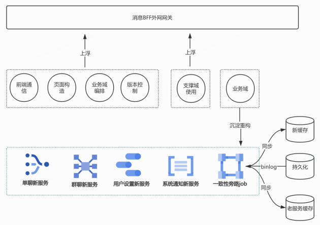 BFF网关吸收上浮的业务逻辑,控制需求向核心领域传导。服务端基于业务领域的能力边界,抽象出单聊、群聊、系统通知、互动通知和消息设置共五个新服务,提升微服务健康度。