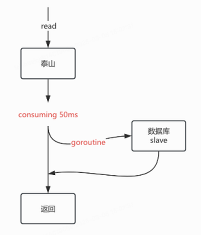 查询redis未命中时会优先回源泰山,考虑到泰山99分位线在50ms以下,而且Mysql多从实例都能承受来自C端的读请求,所以采用比泰山报错后降级Mysql稍微激进的对冲回源策略。在泰山出现“长尾”请求时,取得比较好的耗时优化效果。可以使用大仓提供的error group结合quit channel实现该回源策略,同时能避免协程泄漏。整个处理过程在业务响应和资源开销中维持中间的平衡,等待泰山的时间可以灵活调整。
