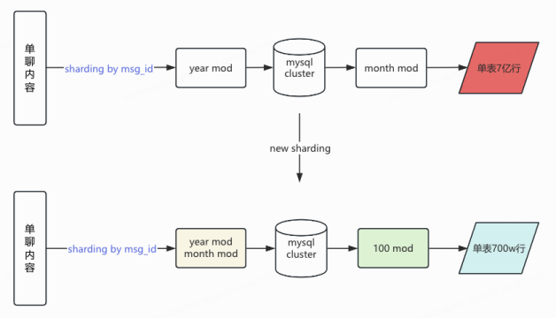单聊分库规则升级为月度分库,单库内分表为100张。 群聊、应援团小助手和历史单聊依然使用旧的分库分表规则读写Mysql。