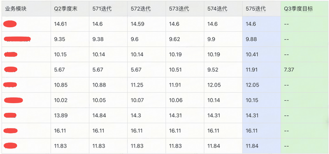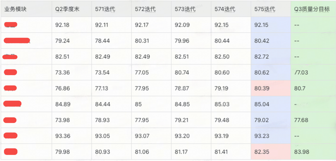 每个季度初期会根据不同业务域应用的质量情况来制定当前季度可达成的质量分目标,并且在季度末以此目标来最终复盘应用质量分的治理情况,如下是2025年Q3季度的整体质量分治理情况: