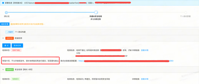 同时在构建发布流程中保留研发流程卡点的情况下,在MR阶段也新增了质量分的卡点,只要检测出有强卡的情况下,就不允许合并到release分支,确保了合入代码的质量和标准规范,如下图所示: